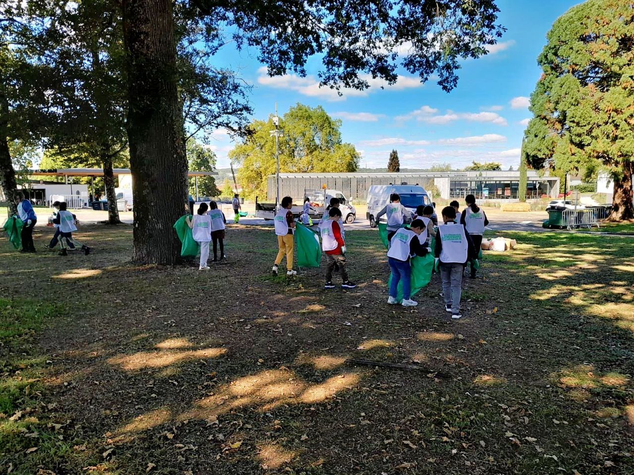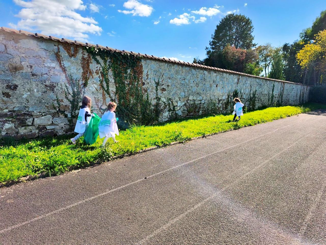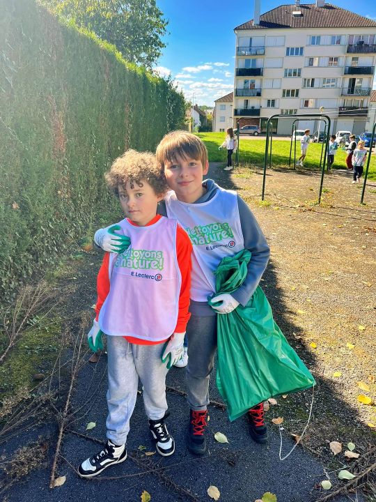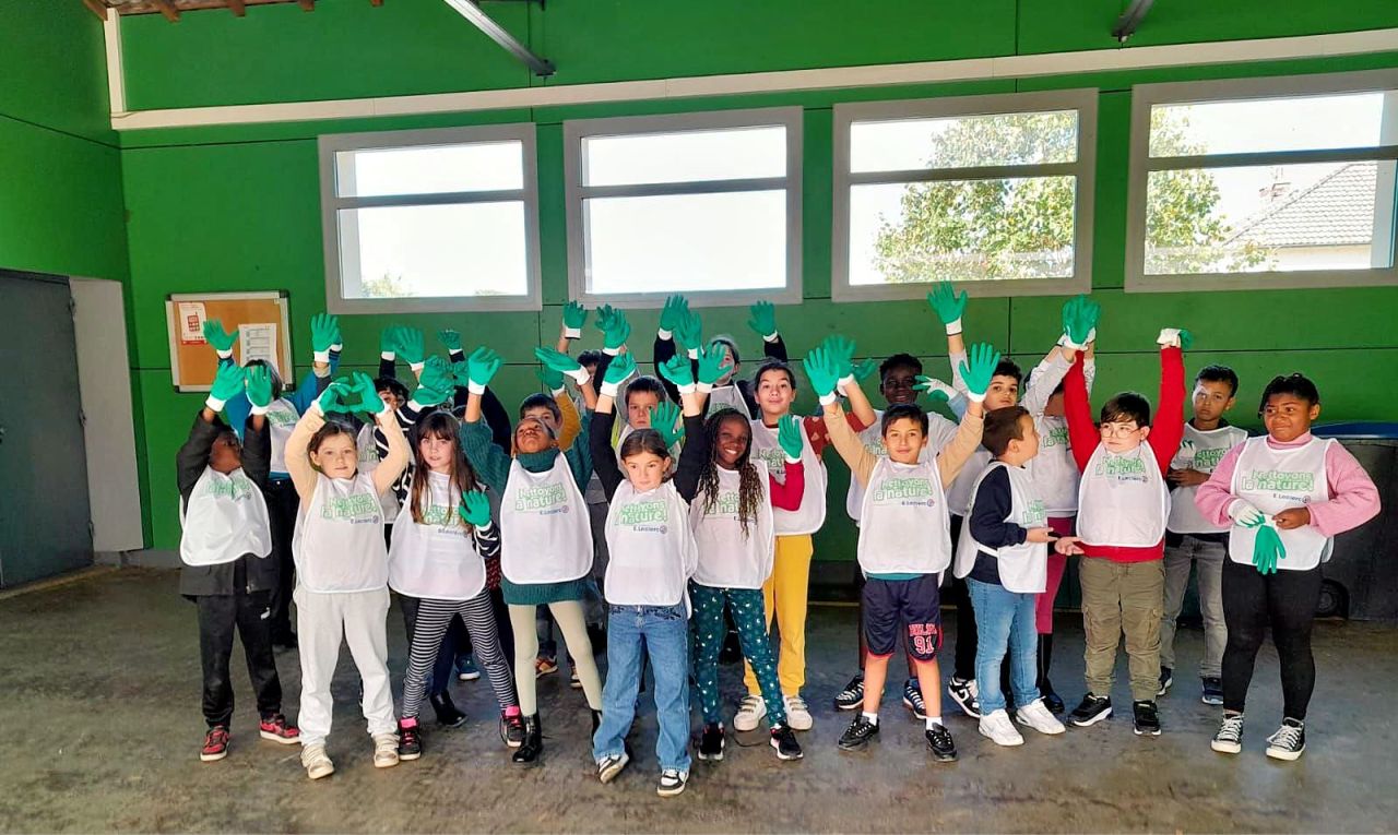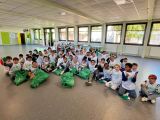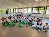 Grâce au partenariat avec une enseigne de la grande distribution, nous avons pu disposer du matériel nécessaire : gants, chasubles et sacs poubelles. Nous avons également pu distribuer à chaque enfant une madeleine, une pomme et un jus de fruit offert avec le matériel.